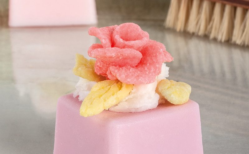 Anleitung in 17 Schritten Für diese außergewöhnliche Seife kombinierst du beide Techniken. Die viereckige Grundform wird gegossen, die Rose darauf bringst du mit Knetseife in Form.