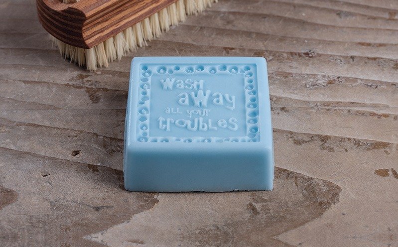 Bei den Seifen mit Motiv bzw. Schriftzug positionierst du das Label mit der Prägung nach oben.