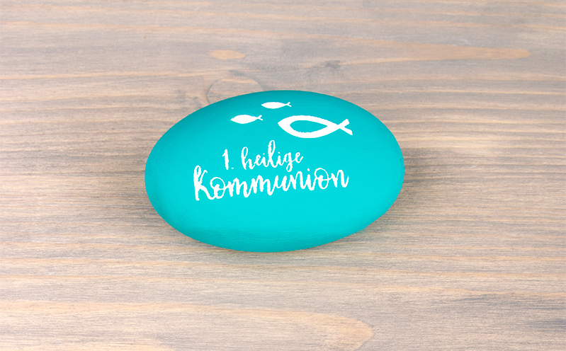 Schneide das Motiv 1.heilige Kommunion aus der Siebdruckschablone aus und entferne es vom Trägerpapier. Platziere die Schablone mittig auf dem Stein. Ziehe die Schablone leicht über die Oberfläche des Steins und streiche sie gut mit den Fingern fest. Das aufgelegte Motiv darf keine Falten bilden, muss gut aufliegen und sich der Oberflächenform des Steines gut anpassen.4 ![]()