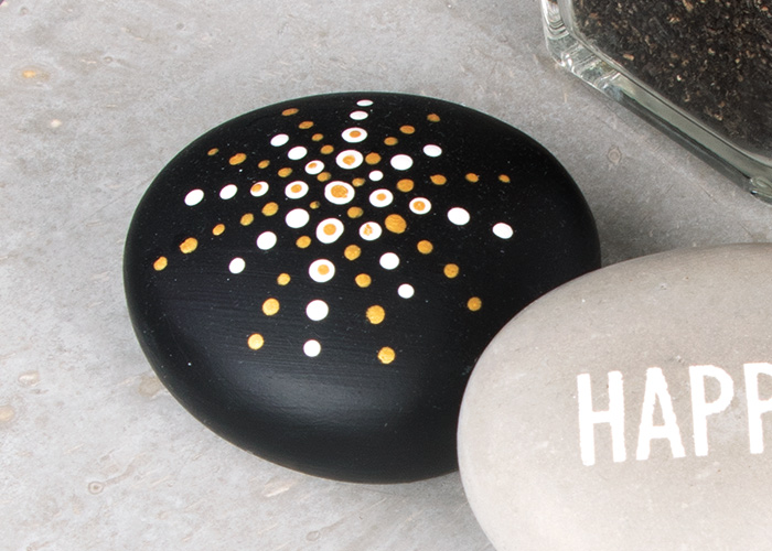 Bemale den Stein mit Allesfarbe schwarz. Mit Hilfe des Dot Painting Metallstiftes setzt du mit der Allesfarbe schneeweiß unterschiedliche Punkte. Arbeite von der Mitte des Steines aus, sternförmig mit großen Abständen. Anschließend verwendest du Extreme Sheen gold und setzt ebenso sternförmig kleine Punkte dazwischen.6 ![]()
