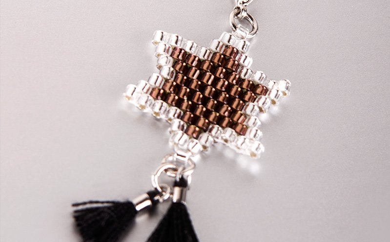 Anleitung in 14 Schritten Silberne und bronzefarbene Rocailles-Perlen fädelst du zum Stern auf. Mit dem praktischen Karabinerhaken kannst du dein Werk überall dranhängen. Und so geht’s: