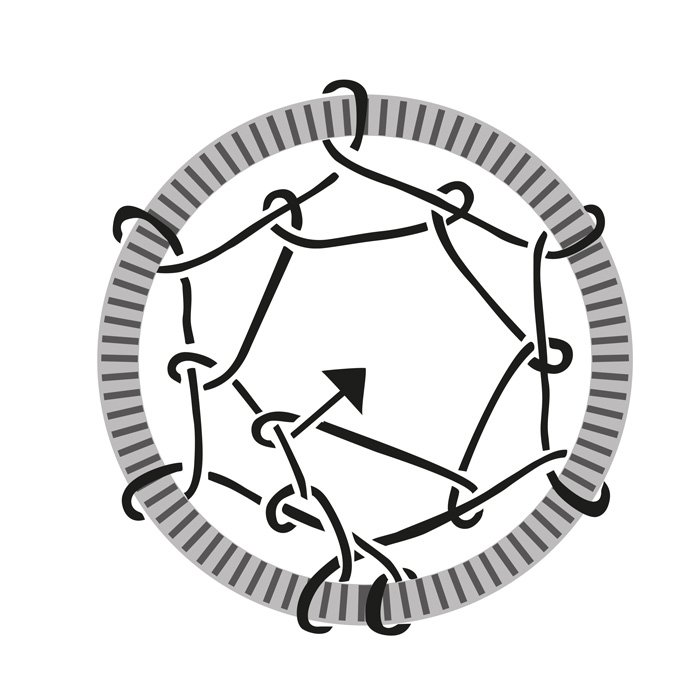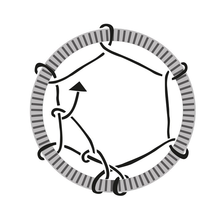 2 Schlaufen auf Höhe der gegenüberliegenden anbringen. Zum Abschluss eine Schlaufe links neben der ersten setzen. Die 2. Reihe mittig beginnen, siehe Schema.