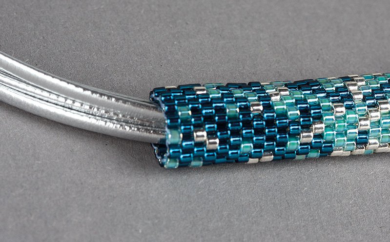 Anleitung in 9 Schritten Die Rocailles-Perlen umschließen die Halskette aus silbernem Kunstleder und kommen so besonders gut zur Geltung. Und so geht’s: