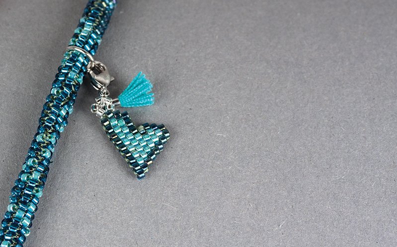 8. Reihe 2 Rocailles petrol fädeln, danach durch die Rocailles zum äußeren Herzbogen fädeln. Für die Öse 5 Rocailles türkis auffädeln. Zur Verstärkung 3 – 4 Mal durch diese Öse fädeln. Die Fäden vernähen und die Reste abschneiden.20 ![]()