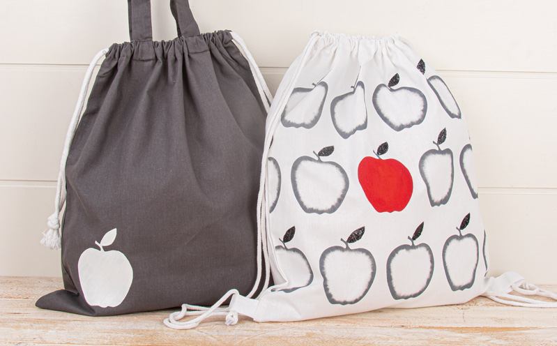 Anleitung in 6 Schritten Der rote Apfel auf dem Turnbeutel wirkt extra plastisch, wenn du zwei verschiedene Rottöne verwendest und dabei den dunkleren für die Kontur nimmst.