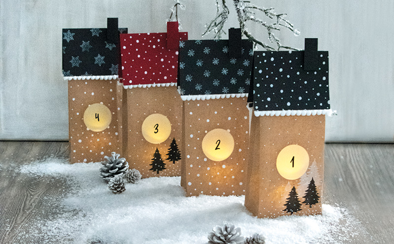 Anleitung in 8 Schritten Die Papierhäuschen leuchten so schön, weil du in die Papiertüten LED Kerzen stellst. Die Wintermotive fertigst du aus Tonkarton an und verzierst sie. Und so geht’s: