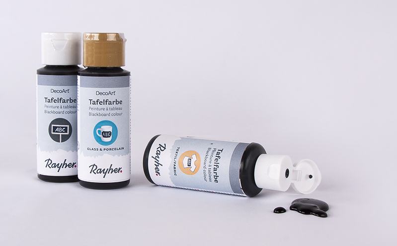 Gestalte dir deine eigene Tafel. Mit unserer Tafelfarbe erhältst du im Nu beschreibbare und wieder abwischbare Flächen. Ist der Untergrund schon mit Acrylfarbe bemalt? Trag einfach unseren transparenten Tafellack drüber und fertig ist deine wiederbeschreibbare Fläche. Besonders originell: bestreich Stoffflächen mit „Tafelfarbe Textil“ und mach dein Lieblings-T-Shirt zum echten Hingucker.