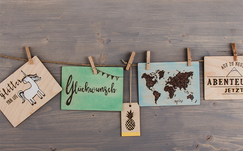Was gibt es Beruhigenderes als das Arbeiten mit Holz? Und ganz nebenbei kannst du dir mit unserem Brandmalkolben noch trendige Homedecoration, einzigartige Küchenaccessoires oder kleine Goodies für eure Vintage Hochzeit gestalten. Altbacken war gestern! Mit unseren angesagten Motiven kannst du sofort starten – und sogar individuelle Holz-Postkarten versenden.