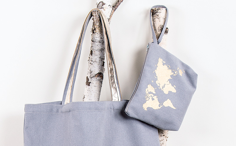 Anleitung in 4 Schritten Für den nächsten Road Trip – Die goldene Weltkarte bringst du mit einer Siebdruck-Schablone auf das graue Stofftäschchen.