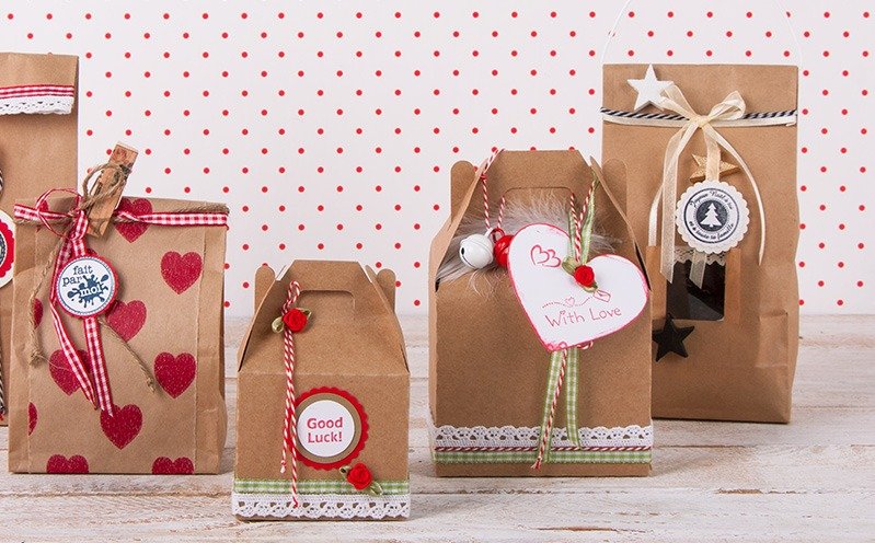 Das 30 cm Karoband und 30 cm Bäckergarn durch den Henkel der Geschenkbox fädeln, den gestalteten Herz-Anhänger auffädeln und mit dem Röschen verzieren.4 ![]()
