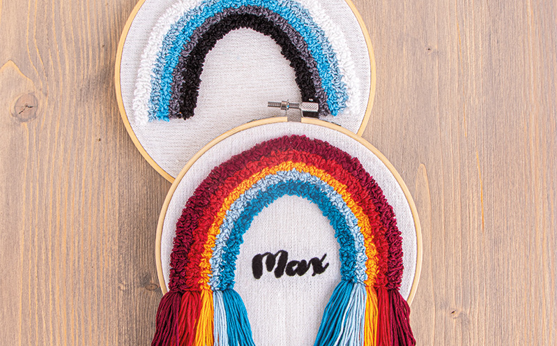 Fädle das Baumwoll-Garn für den äußersten Regenbogen in die Punch Needle ein und beginne mit der äußeren Kontur des ersten Regenbogens. Arbeite reihenweise von außen nach innen bis der oberste Regenbogenteil ausgefüllt ist. Schneide den Anfangs- und Endfaden ab. Nun folgen die weiteren Regenbogen-Streifen. Arbeite wie gerade beschrieben, bis der letzte Regenbogenteil ausgefüllt ist. Schneide den Anfangs- und Endfaden ab.9 ![]()
