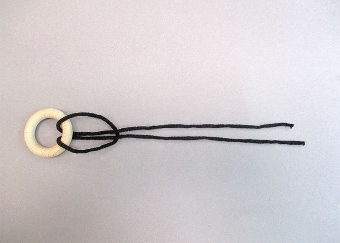 Lege die Fäden doppelt und ziehe das geschlossene Ende durch den Rohholzring. Die Enden des Garns durch die entstandene Schlaufe ziehen.3 ![]()