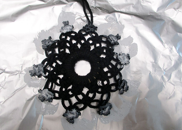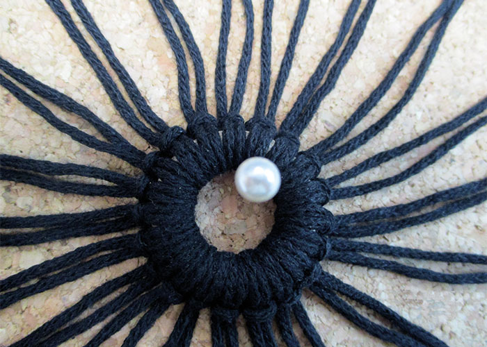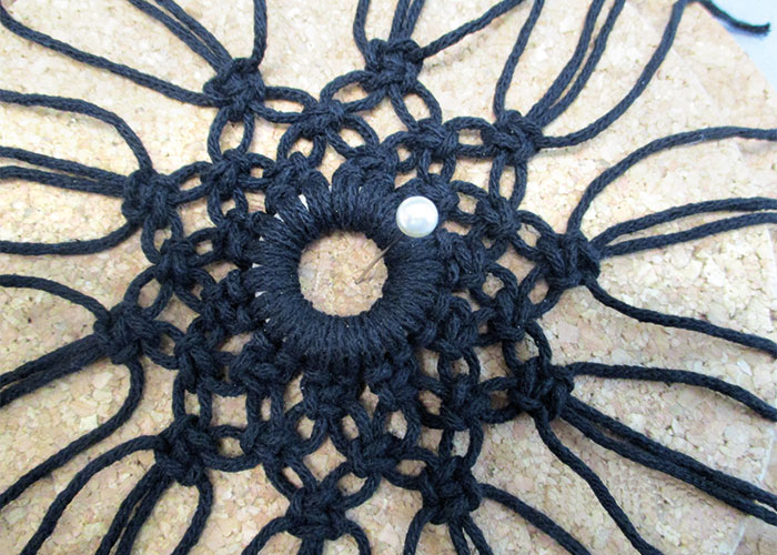 Fixiere alle Stränge an dem Rohholzring. Befestige den Rohholzring auf einer Korkunterlage mit einer Perlen-Kopfstecknadel.4 ![]()