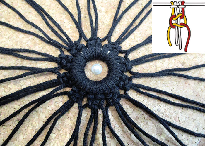 Mit 4 Kordeln knüpfst du einen Weberknoten, für die erste Reihe brauchst du 10 Weberknoten.5 ![]()