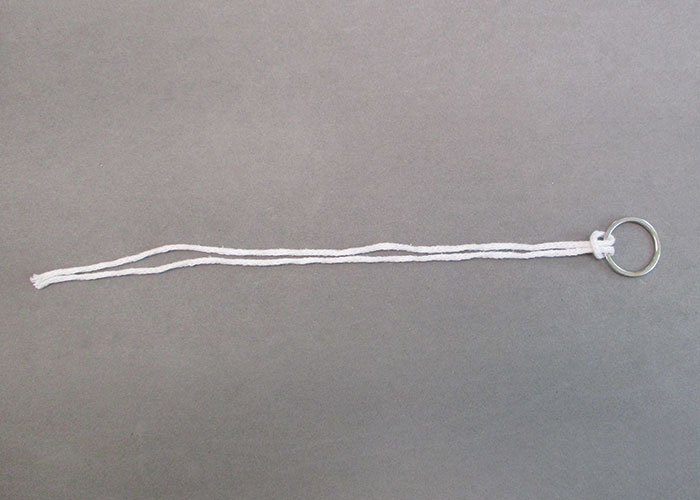 Lege die Fäden doppelt und ziehe das geschlossene Ende durch den Metallring. Die Enden des Garns durch die entstandene Schlaufe ziehen.3 ![]()