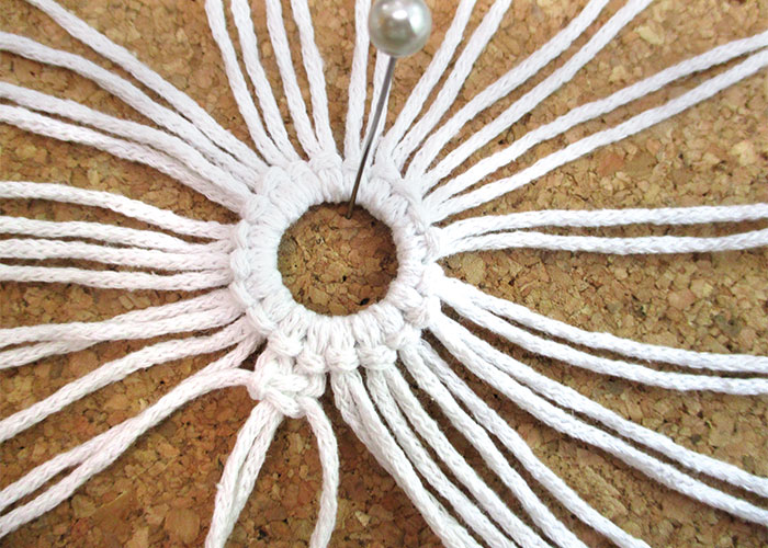 Fixiere alle Stränge an dem Schmuckring. Befestige den Schmuckring auf einer Korkunterlage mit einer Perlen-Kopfstecknadel.4 ![]()