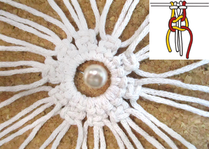 Mit 4 Kordeln knüpfst du einen Weberknoten, für die erste Reihe brauchst du 10 Weberknoten.5 ![]()