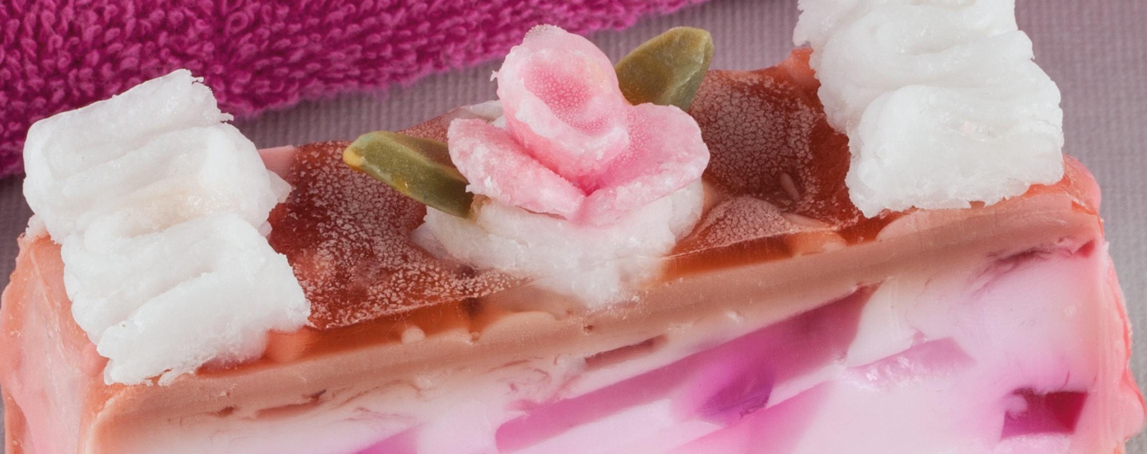Pour the chocolate gaze over the demoulded soap bar (see instructions for glaze). Make a cream rosette (see instructions for cream rosette) and a little rose (see instructions for the rose out of kneading-soap) out of the kneading-soap.7 ![]()