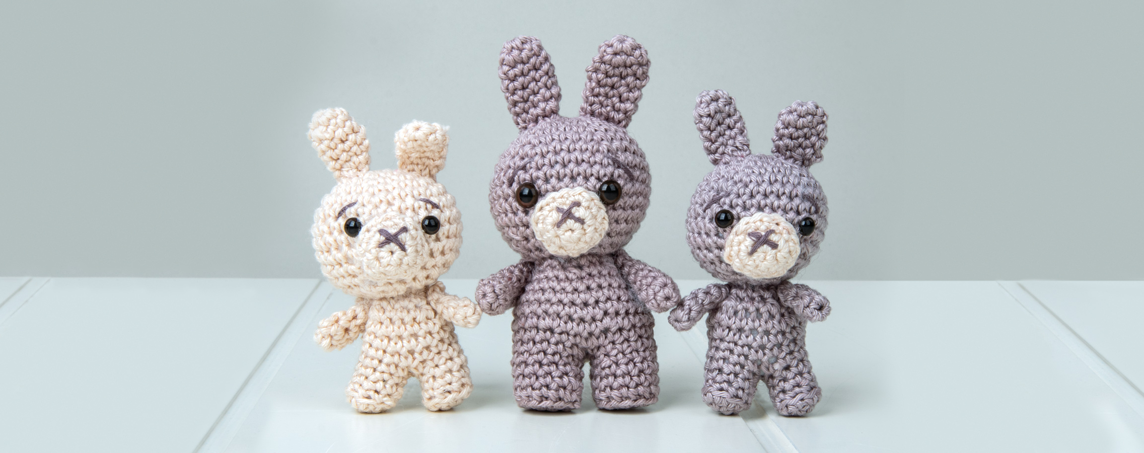 Start with the feet (crochet twice) 1. rd. with C taupe, join 6 dc in the thread ring, close with ss to form a ring. 2. rd. 1 ch, each dc dc2tog (12 st), 1 ss 3. rd. 1 ch, crochet 12 dc insert hook only in BL (12 st), 1 ss 4. to 6. rd. 1 ch, crochet 12 dc (12 st), 1 ss Cut a piece of solid cardboard in the shape of the feet and insert it. To do this, place the rabbit's foot on the cardboard, trace the outline with a pencil and cut it out slightly smaller. 7. rd. 1 ch, crochet 24 dc over both legs together (24 st) (if necessary, sew the small loophole between the legs together with a few stitches), 1 ss 8. rd. 1 ch, crochet 24 dc (24 st), 1 ss 9. rd. 1 ch, each 4th dc dc2tog (30 st), 1 ss 10. rd. 1 ch, the 8th and 9th st as well as the 24th and 25th st tr2tog (28 st), 1 ss 11. rd. 1 ch, the 9th and 10th st as well as the 23rd and 24th st tr2tog (26 st), 1 ss 12. rd. 1 ch, the 7th and 8th st as well as the 21st and 22nd st tr2tog (24 st), 1 ss 13. rd. 1 ch, each 3rd and 4th dc tr2tog (18 st), 1 ss 14. rd. 1 ch, crochet 18 dc (18 st), 1 ss Put some lead tape on both feet so that the rabbit stands securely. Stuff the body with wadding. 15. rd. 1 ch, each 2nd and 3rd dc tr2tog (12 st), ss bind-off, cut the thread long and let it hang. Pull the remaining stitches together with a wool needle.4 ![]()