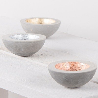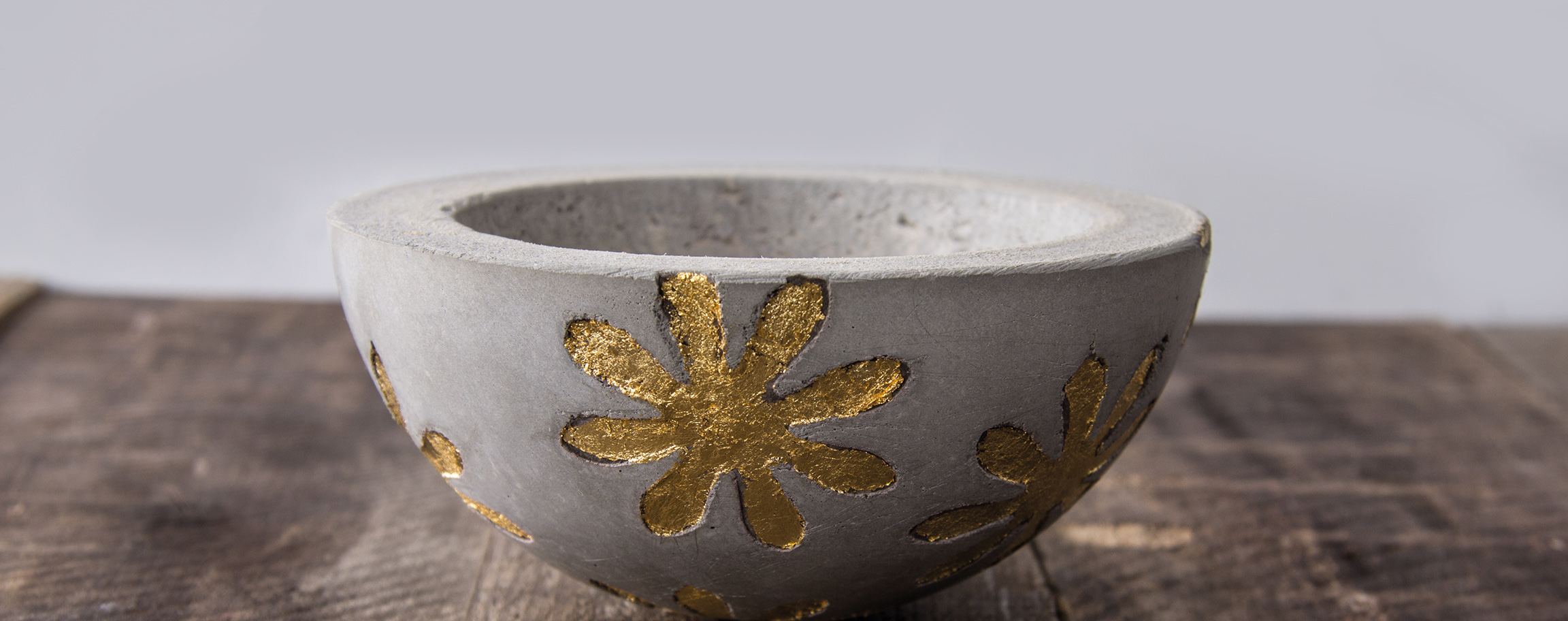 Instructions in 10 steps The floral pattern is achieved by placing punched out flowers on the concrete mould and by decorating them with golden decorative metallic flakes after they have dried out.