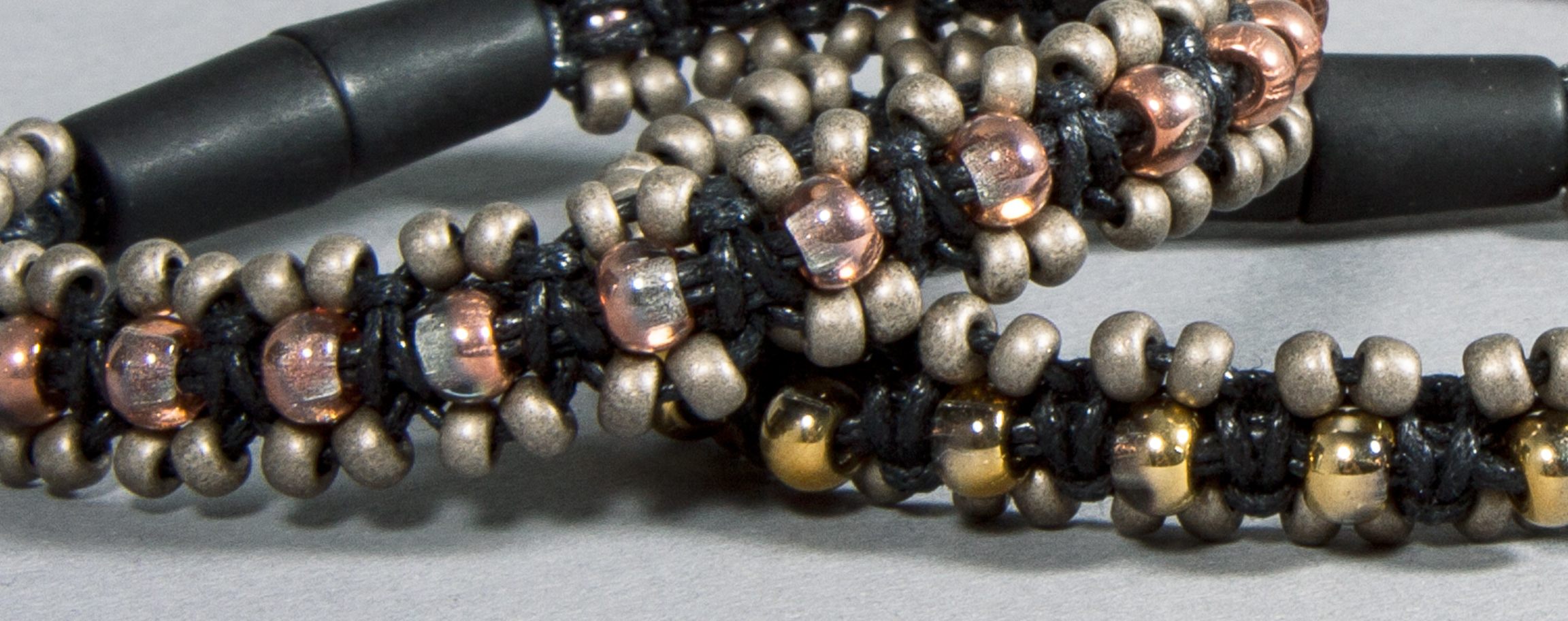 60 min Instructions in 6 steps Rocailles beads in copper, metallic and grey colours – once strung and knotted according to the instructions – turn into this chic bracelet. And this is how it works: