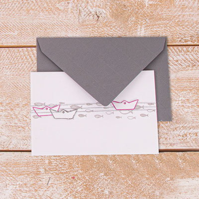 Then trace one fish with the Quickie Glue adhesive stick and sprinkle it with the silver ultra-fine glitter dust. Tap off loose glitter dust. Stamp two boats by means of the stone-grey StazOn stamp pad and one boat with the silver Delicata Metallic stamp pad. Then trace one grey boat with the Quickie Glue adhesive stick and sprinkle it with the silver ultra-fine glitter dust, and tap off loose glitter dust.3 ![]()