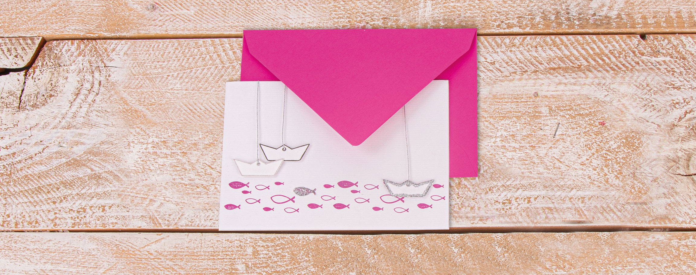 Cut the boats out and punch a hole with the punch pliers at the top, in the middle of the boats. Stick the 3D adhesive square onto the rear side of the stamped boats. Cut 3 strands out of the silver metallic yarn of 15 cm each, and thread one boat per strand and tie a knot on the rear side of the boat. Now you can place the boats on the card. Knot the yarn ends on the inside of the card and affix them by means of the double-sided adhesive tape.4 ![]()