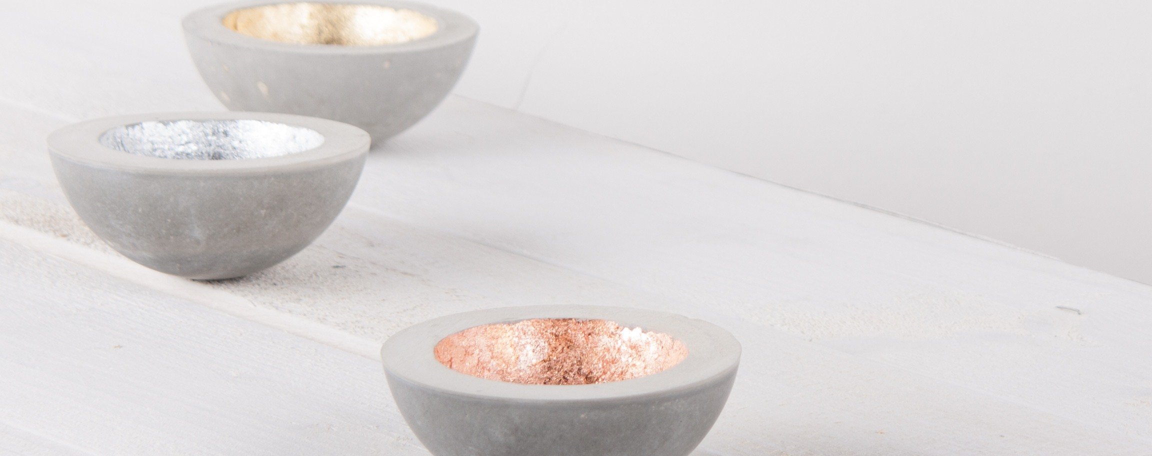 Instructions in 8 steps Provide the concrete bowl with extra sparkle. After drying, distribute silver and gold decorative metal flakes inside the bowl.