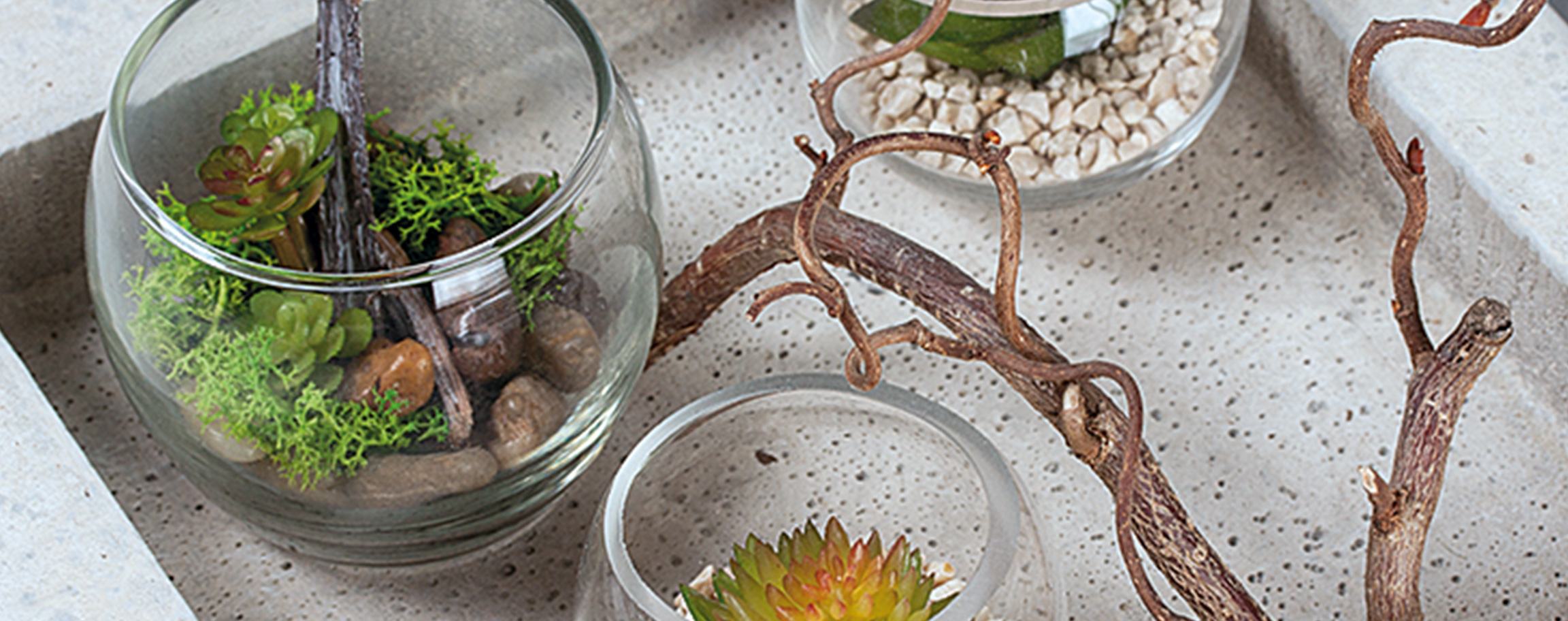 Fill the two small glass vessels with some beige granulate and insert re-spectively one mini succulent “Echeveria” and mini succulent “Haworthia” in the center. Decorate the big glass vessel with iceland moss, river pebble and succulent “Sedum”.4 ![]()
