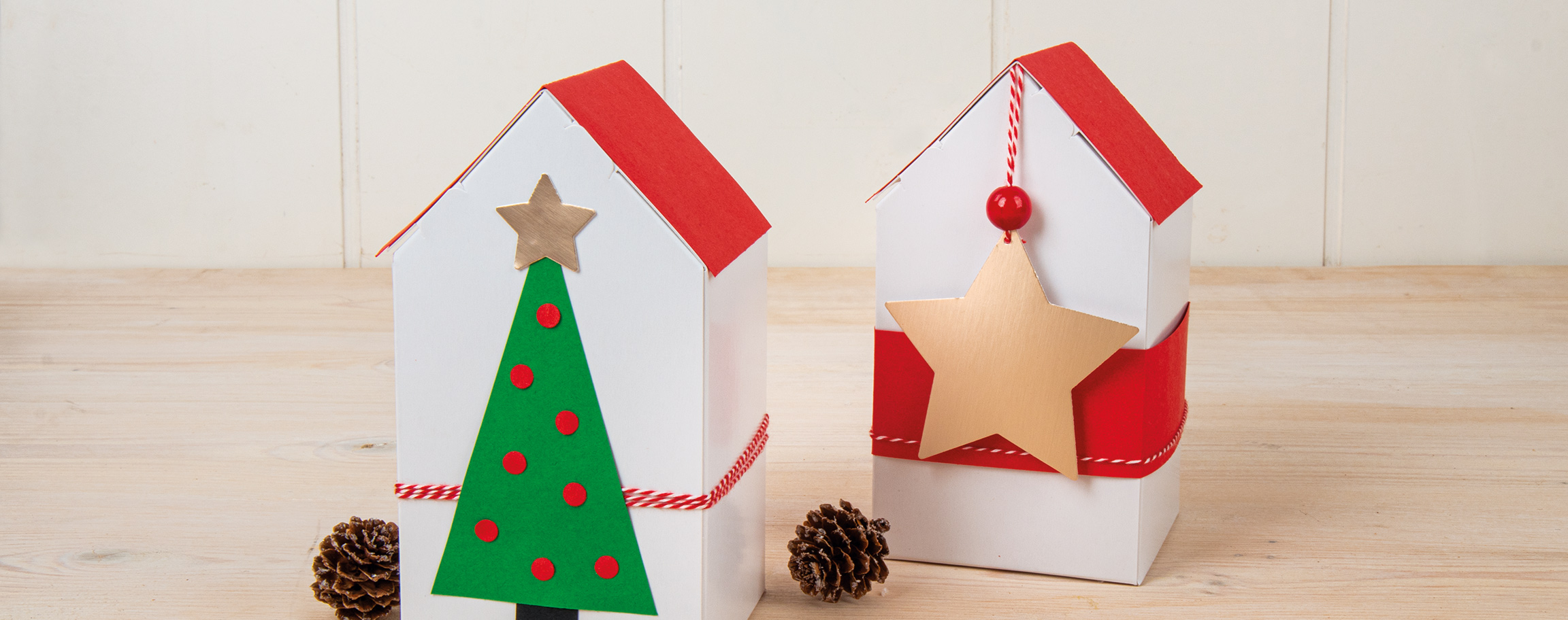 Instructions in 5 steps  Easy to make even for the little ones. Once the house shell has been folded, decorate it with craft cardboard - and the Christmas decoration is ready.    And this is how it works: