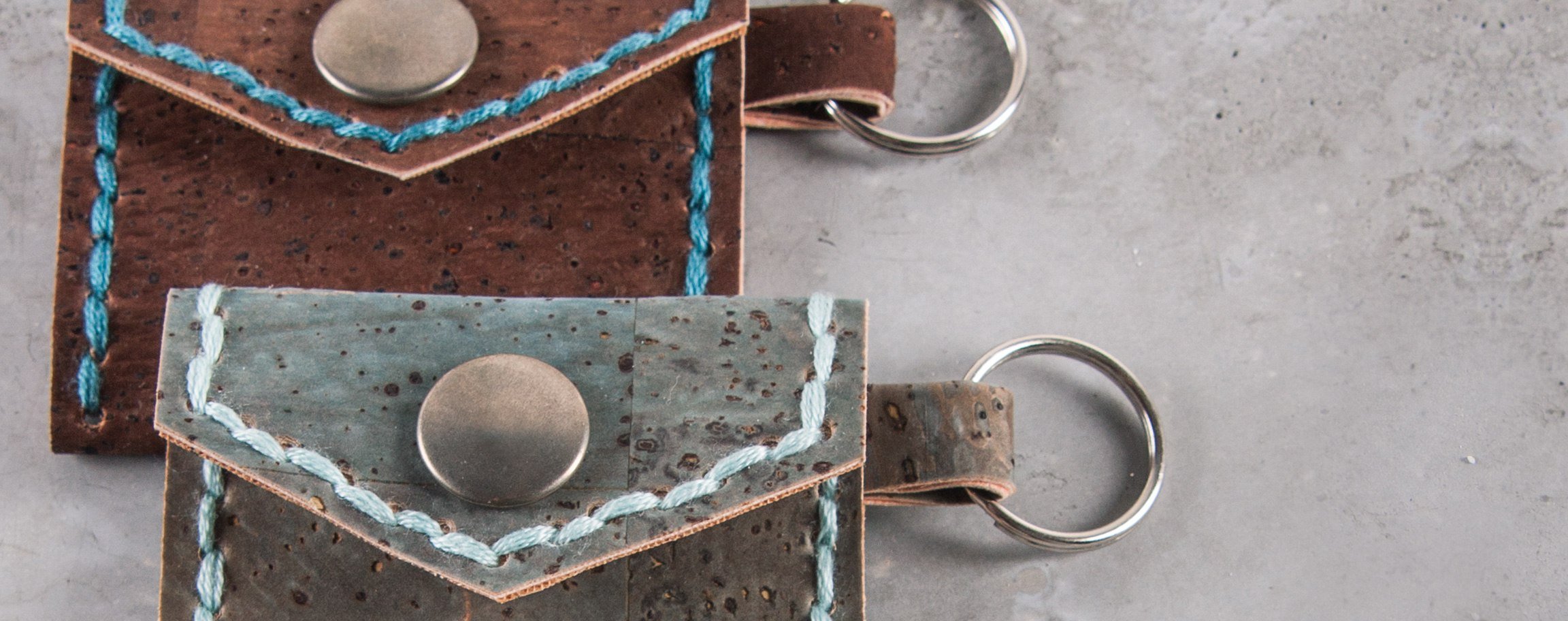 As a tab, fold the small cork cutting left sides together 2 cm × 5 cm centric over the length and fix it somehow with the dou-ble-sided adhesive tape (this will be later on the fastening for the key ring). Fold the lower part of the pouch, put the tab between the right lateral seam of the pouch and fix those with a few pins.4 ![]()