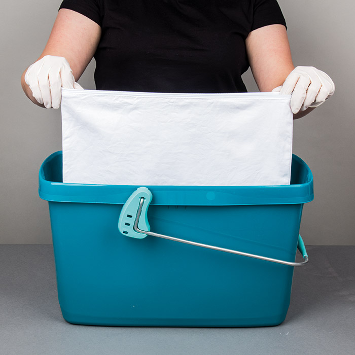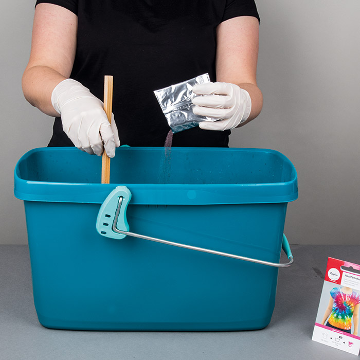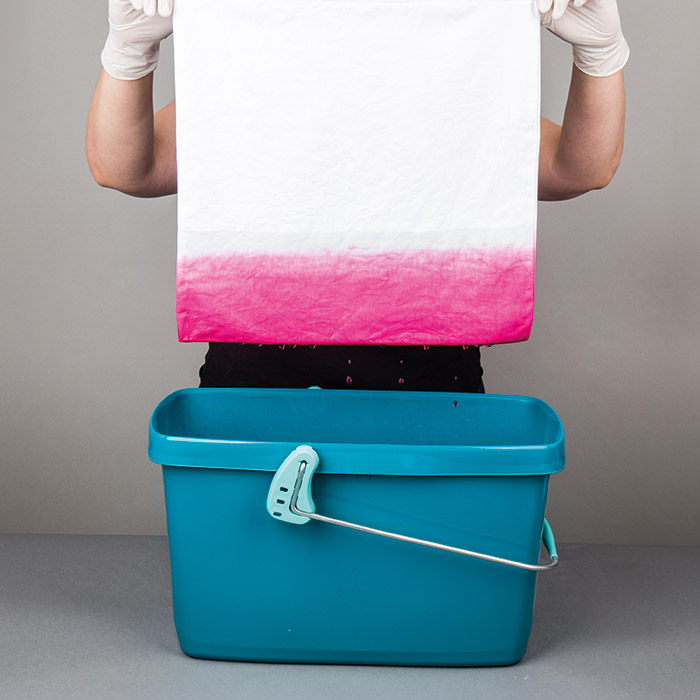 Now dip the pillowcase slowly and evenly into the dye bath to a depth of about 10 cm. Keep it that way for a few minutes. The dyeing time has also an impact on the intensity of the colour shade.5 ![]()
