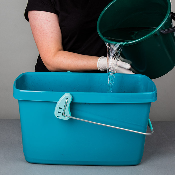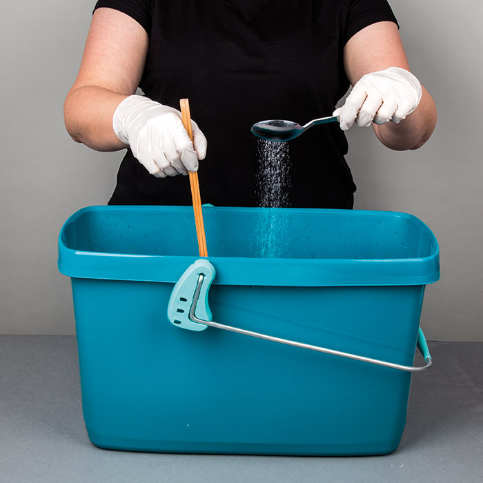 Now add about 2 l of warm water from the tap so that you reach an immersion depth of 10-15 cm when immersing in the cushion. The water amount depends on the size of your dyeing vessel and can therefore vary. The temperature should be at least 40-50°C. Dyeing can be done up to 90°C. The hotter the dye bath, the more intense the dyeing result.4 ![]()