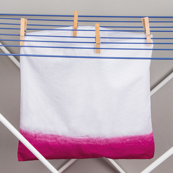 Then take the pillowcase out of the dye bath and let it drain well. Then hang it straight down on open clothes drying rack.Important: Do not forget to put something underneath the clothes drying rack, as the paint will drip down.