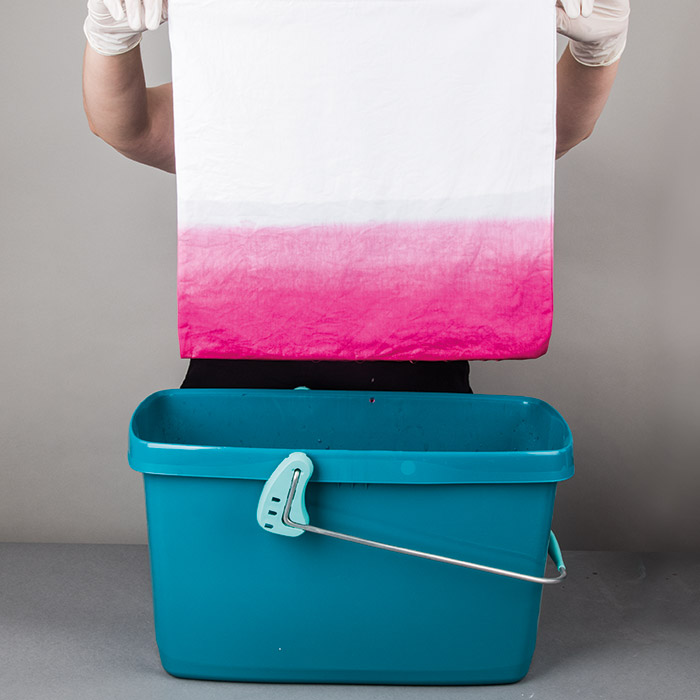After 2-3 hours, you can achieve lighter colour shade through a dipping process. To do this, dilute the existing dye bath with approx. 2-3 litres of warm water and repeat the dipping process. Now dip the pillowcase into the dye bath about 5 cm deeper than the first time and then take the pillowcase immediately out. That’s how a beautiful colour gradation from dark to light is reached.7 ![]()