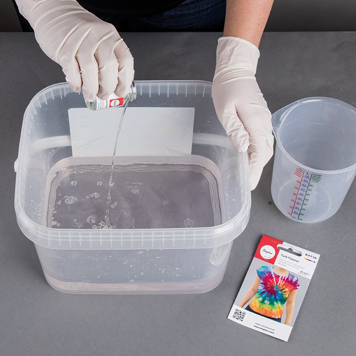 Preparation: In preparation for the dyeing process, pre-wash the pillowcase without fabric softener to wash out the finishing of the fabric. Iron it before dyeing so that there are no creases in the fabric. Prepare all the work materials and make about 2 l of water boil, dissolve about ½ of the batik dye pack in the vessel intended for dyeing filled with hot water using the stirrer.2 ![]()