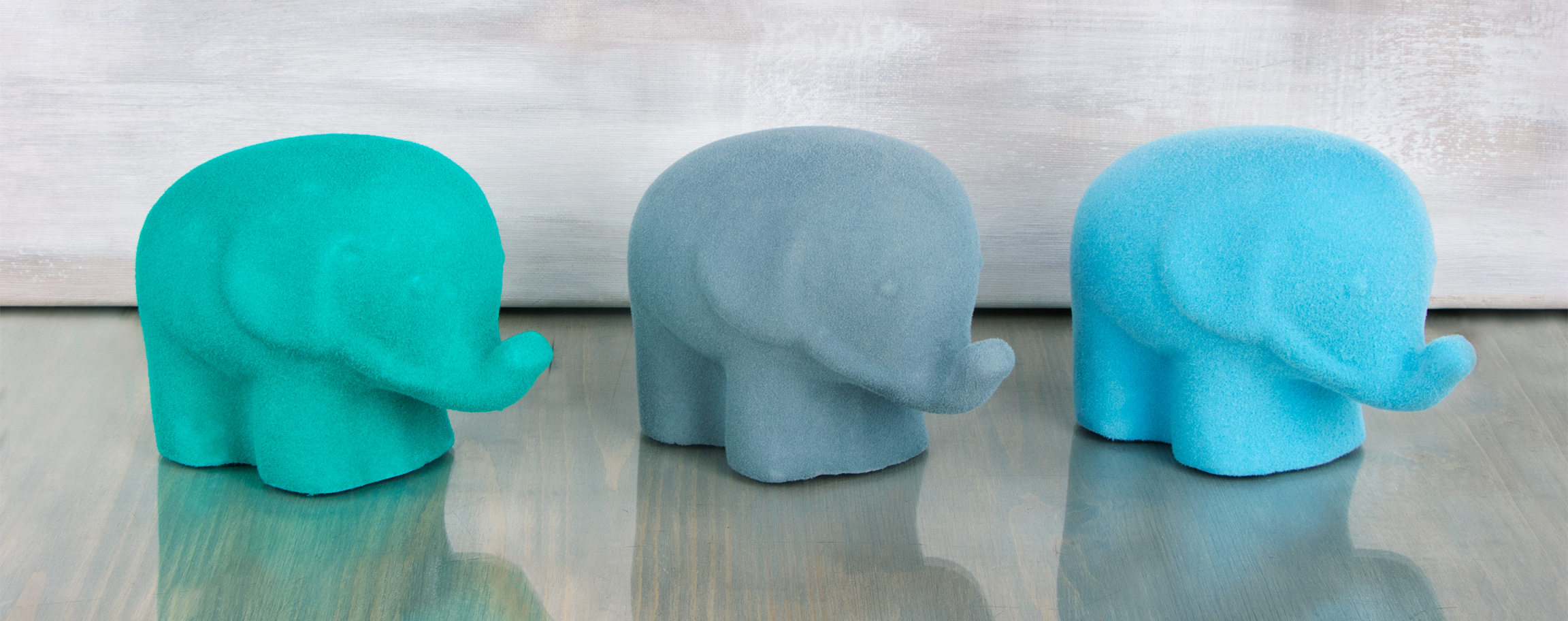 Coat richly the entire surface of the styrofoam elephant with the glitter dust glue (approx. 1 mm, so that the adhesive does not drip). Sprinkle immediately the viscose flocking powder onto the still wet glitter dust glue. Let it dry well out, preferably overnight. You can put the skewered elephant in a glass for drying.4 ![]()