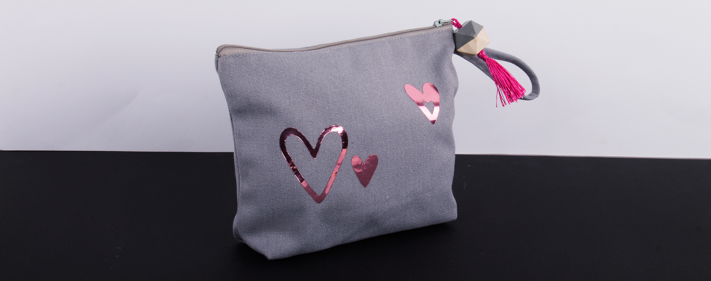 Instructions in 7 steps First punch out hearts from the pink glitter foil, then iron them onto the unicoloured makeup bag.