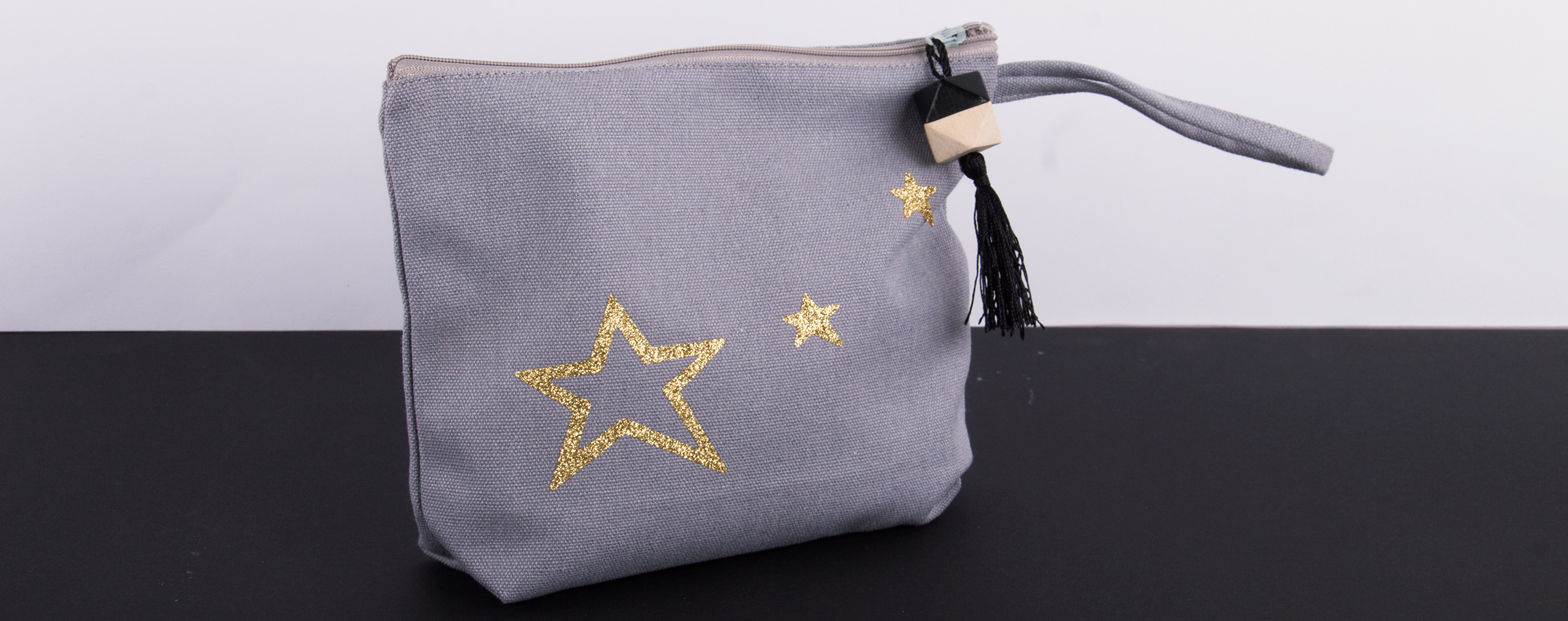 Instructions in 7 steps The fabric pouch in timeless grey is a great eye-catcher thanks to the firstly stamped, then ironed-on gold stars.