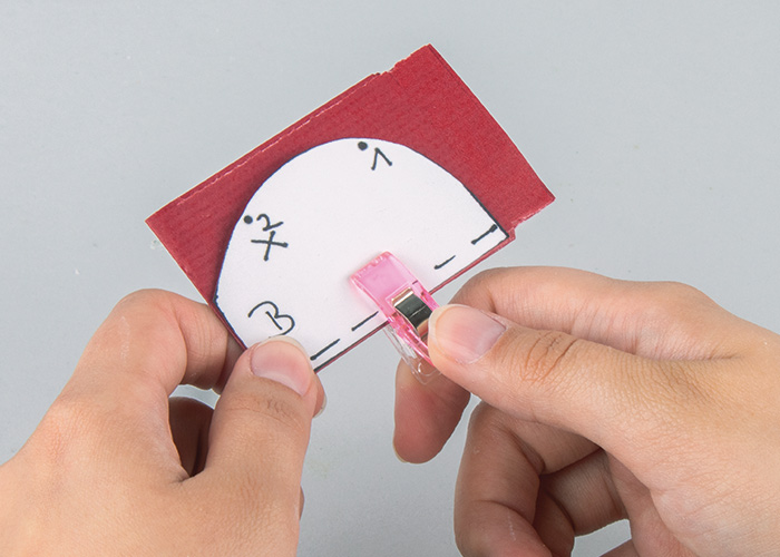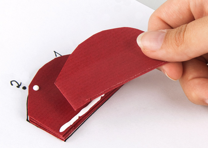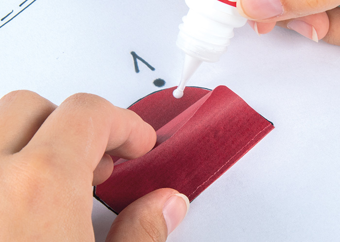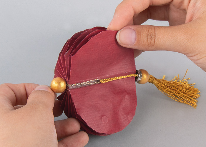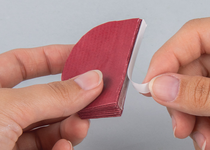 Once you have sticked all the bags together flush, stick a strip of the special double-sided adhesive tape to the stack of bags (inside the honeycomb ball). From the rest of the red paper mini-bag XXS, punch out 2 small circles. Use the paper glue to fix a magnet with the punched-out red circle (see marking ×) on the inside of the first paper mini-bag XXS. Unfold carefully the honeycomb ball and hold the counter-magnet toward the inside of the last paper mini-bag XXS. The counter-magnet is being drawn toward the first one. Then affix firmly the other red circle to the magnet with the paper glue.6 ![]()