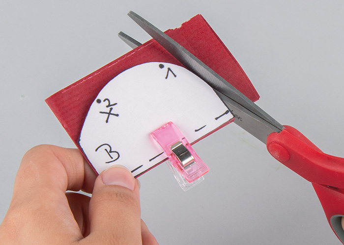 Put 2-3 paper mini-bags XXS on top of each other and fix the template with one or two fixing clamps at the bottom and lateral edge of the bag stack. The opening of the bag points downwards and is visible. The template must always be put identically down! Circle the template with a pencil.2 ![]()