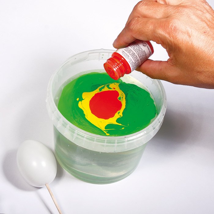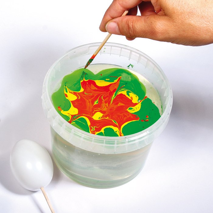 Instructions in 4 steps Pour the marbling paint drop by drop into a water bucket and draw the marble pattern inside with a wooden skewer. And this is how it works:
