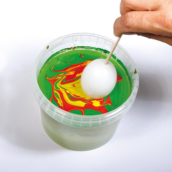 Pull the object slowly into the water, let it in for a few seconds and pull it out quickly. Before pulling out the object, blow over the water, so that the colour flows to the sides of the bucket. Let it dry standing on the spit. After 15-30 minutes the colour is touch-dry.4 ![]()