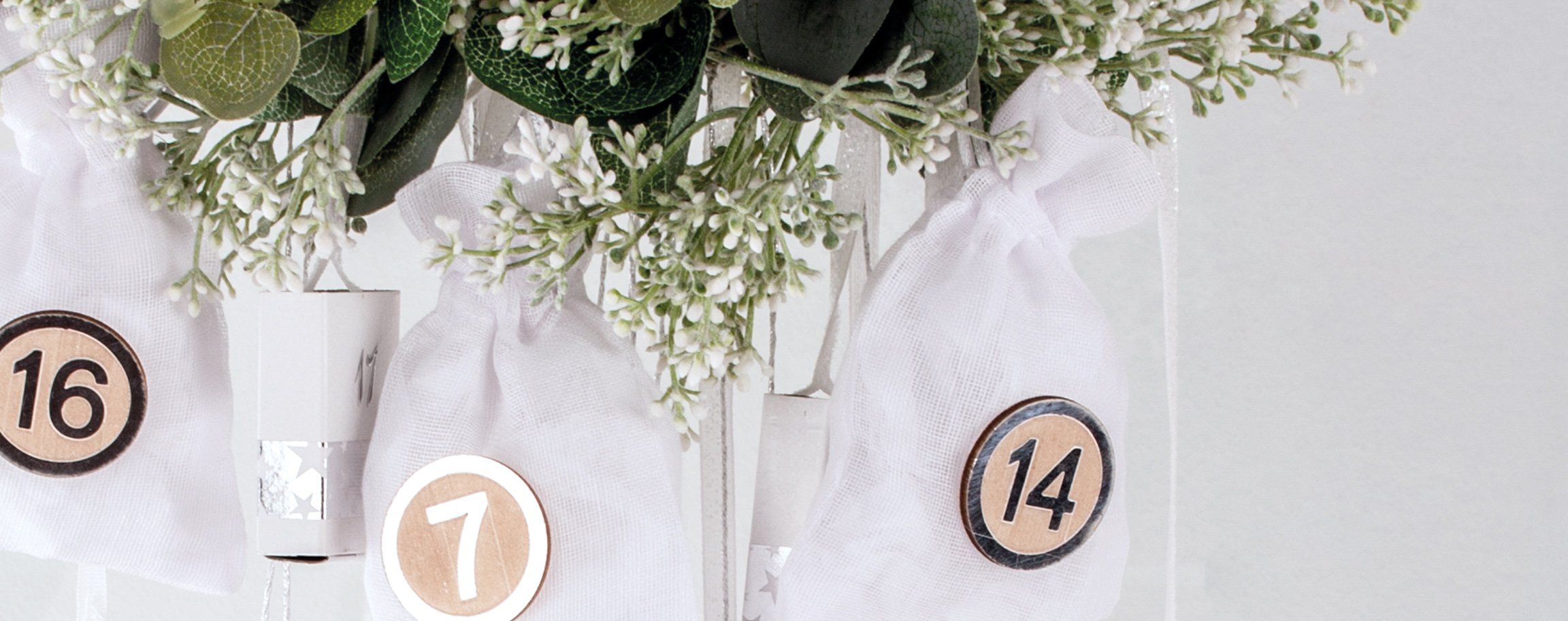 Fill the cotton sachets with tissue paper or small presents, and glue on the MDF Advent numbers.4 ![]()