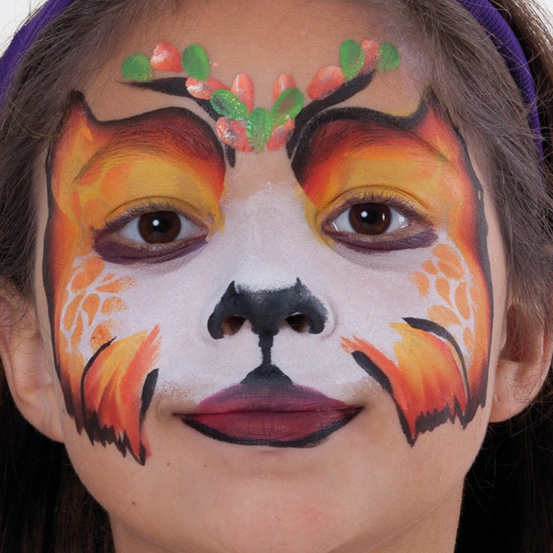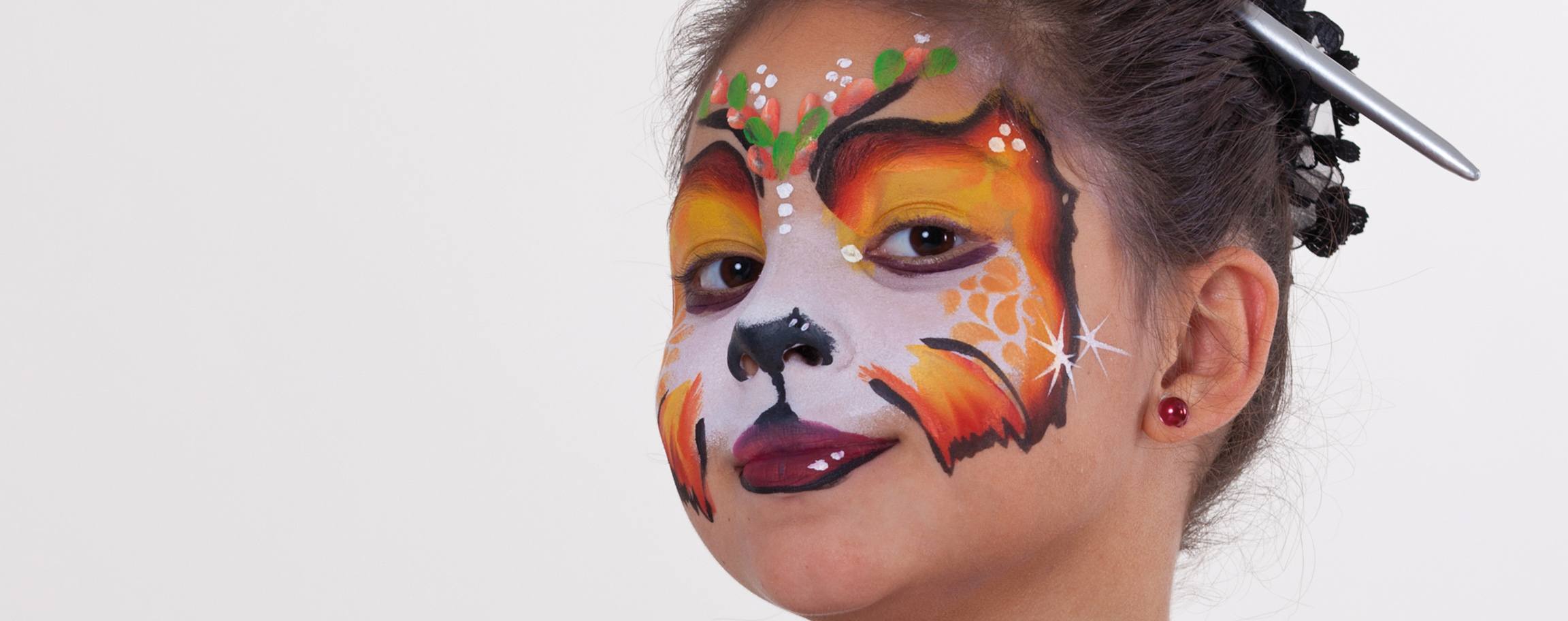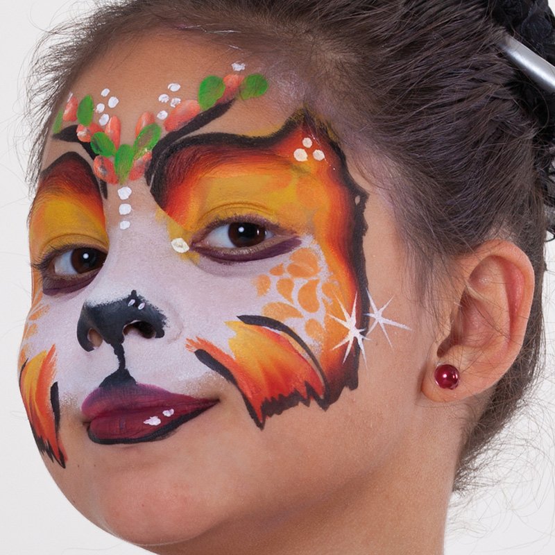 With a „Paint me“ make-up brush first take up white, then red paint on the same brush and paint some drops staggered onto the forehead. In the same fashion, just with yellow and green, place the leaves in between the drops.8 ![]()