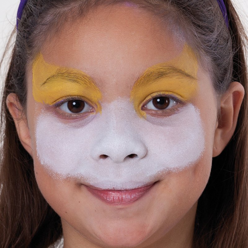 Moisten one side of the sponge with a little bit of water and take up „Paint me“ paint yellow. Dab the sponge on some kitchen paper, so that it is relatively dry. Place the “Paint me” stencil “Drops” flat onto the cheek and dab lightly but evenly over the stencil. Remove the stencil and repeat the process on the other cheek.6 ![]()