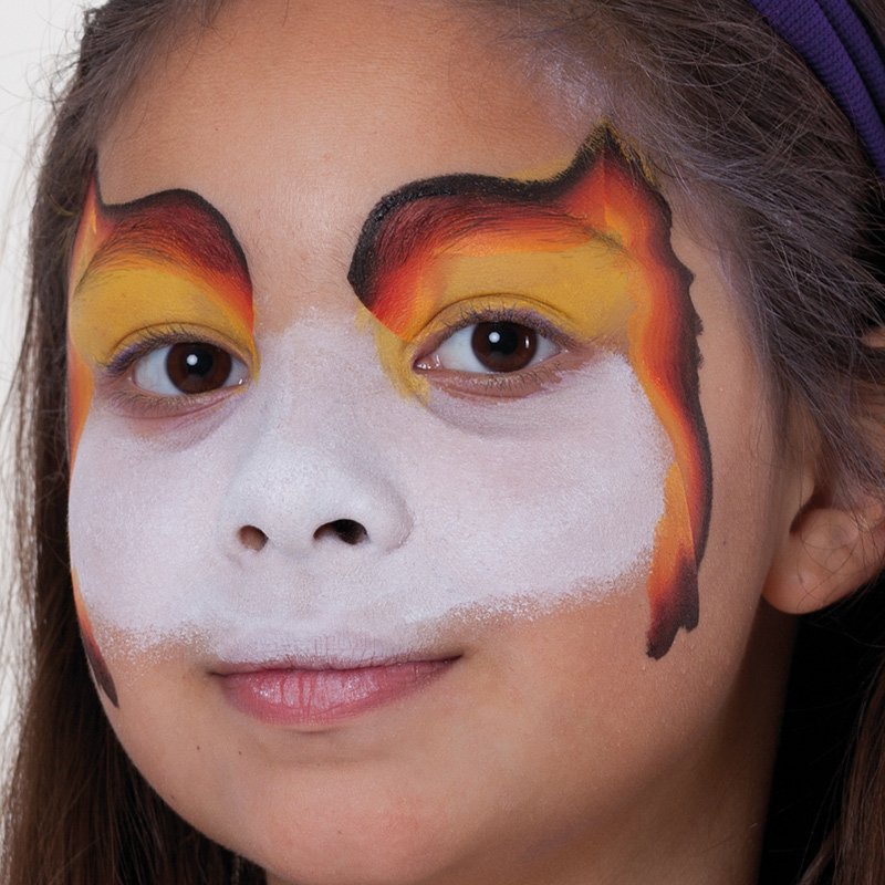 Moisten a flat brush with water. Now take up the „Paint me“ colour (black/red/yellow) consistently by moving the brush forwards and backwards. Place the brush at the inner eye with the dark colour to the outside. With a quick wave motion paint the outer contours and repeat this step on the other side.4 ![]()