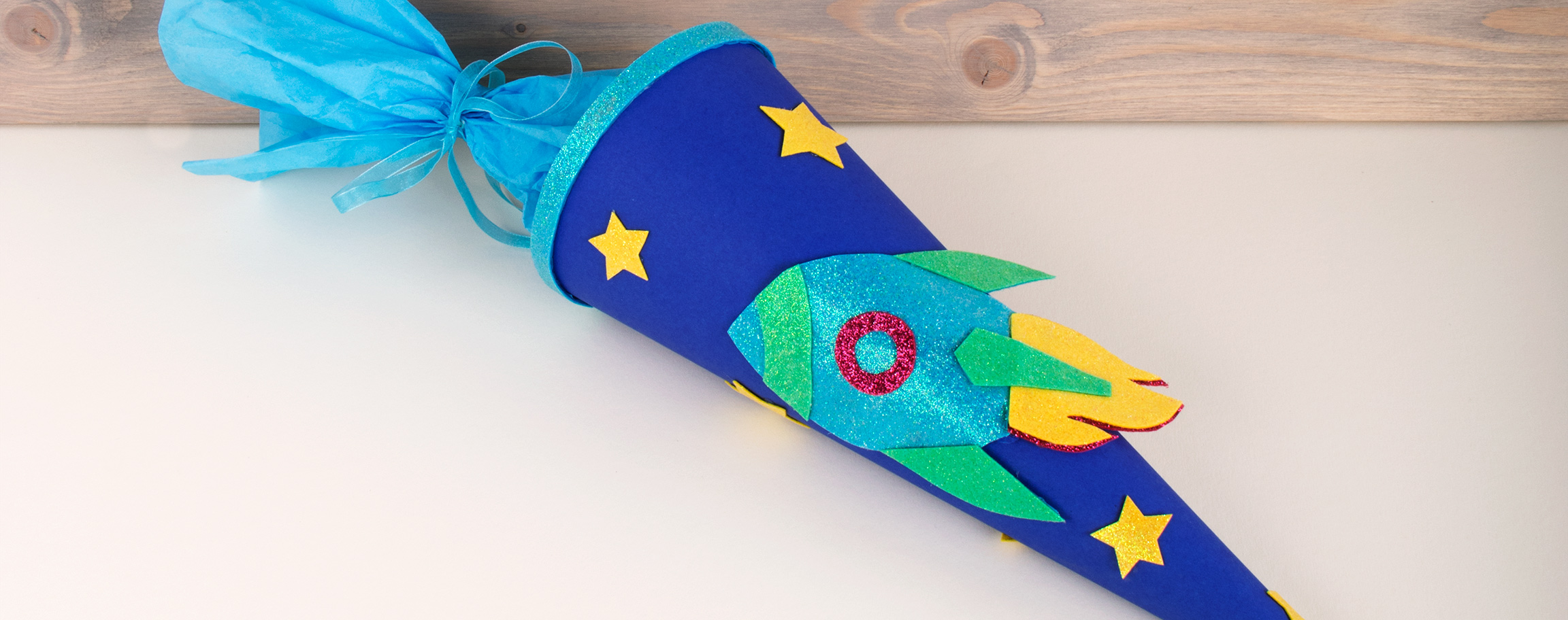 Cut the rocket out of the glitter-felt in the respective colours. Stick the individual cuttings with a rocket together according to the pattern and then affix them centrally to the school cone. Cut 5 big and 5 small stars out of the yellow glitter-felt. You can stick them all over the rocket.4 ![]()