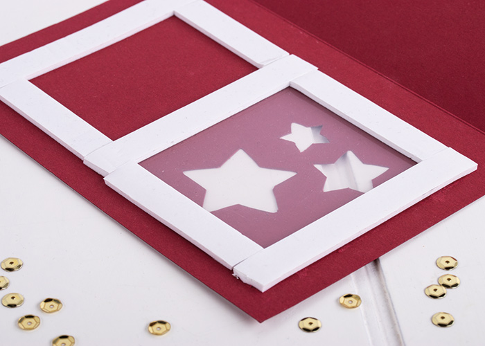Open the card and glue inside the PP-foil cutting over the cut stars. Cover the cutting with the spacer tape on all sides. Make sure that no blank space is left!6 ![]()