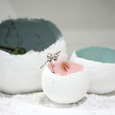 Instructions in 1 steps A coat of modelling putty provides the styrofoam eggs with a special look. Paint it further with Chalky Finish paint and decorate it with feathers, wooden decorative shapes to scatter and natural raffia - the special Easter decoration is ready.